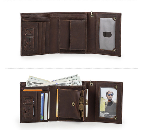 Retro Crazy Horse in pelle con catena di ferro, portafoglio da uomo a tripla piega, spazzola antifurto RFID, portafoglio Multi-funzionale in pelle